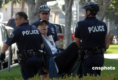 當(dāng)?shù)貢r(shí)間三月十日下午,一名手持“藏獨(dú)”旗幟的男子突然越過(guò)欄桿,沖到中國(guó)駐洛杉磯總領(lǐng)館大門前,一邊高喊“藏獨(dú)”口號(hào),一邊拍打大門,并試圖打開大門。隨后該男子被警察當(dāng)場(chǎng)擒獲,戴上手銬后被押上警車帶離現(xiàn)場(chǎng)。中新社發(fā) 張煒 攝