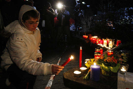 德國總理默克爾和德國聯(lián)邦政府對這起校園槍擊案“感到震驚”,對遇難者家屬表示慰問。默克爾當(dāng)天在新聞發(fā)布會上說,11日是全德國的“哀悼日”。 圖為群眾正在悼念校園槍擊案的亡者。