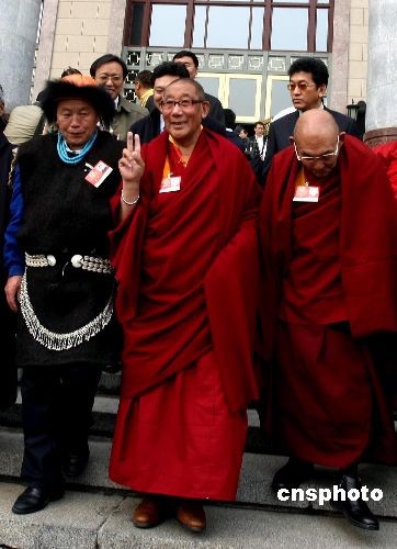 3月12日,全國(guó)政協(xié)十一屆二次會(huì)議閉幕。圖為來(lái)自西藏的宗教界委員阿旺吉卓(中)走出會(huì)場(chǎng)。中新社發(fā) 傅丹丹 攝