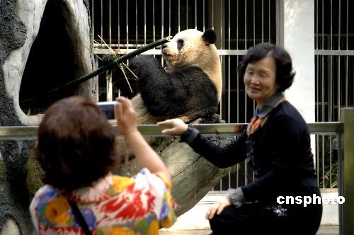 三月十二日,臺灣游客在福州熊貓世界與熊貓近距離合影留念。大熊貓“團團”、“圓圓”在臺灣產生的效應,致使現在來福州觀看熊貓的臺灣游客比以前增加三倍以上。中新社發(fā) 王東明 攝