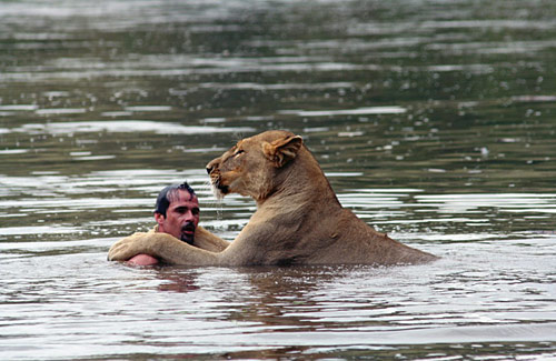 圖:人與母獅一同在河中洗澡(3)