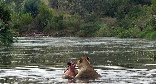 理查德森與母獅在河水中一起游泳
