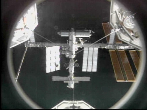 圖為美國國家航空和航天局發(fā)布的“發(fā)現(xiàn)”號與國際空間站對接電視截圖。