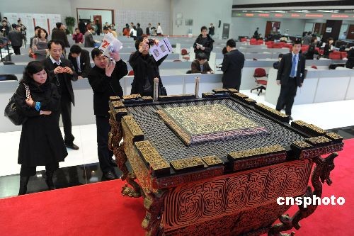 3月18日,2008北京第29屆奧運(yùn)會(huì)開幕式演出道具“缶”最后一場(chǎng)專場(chǎng)拍賣在北京產(chǎn)權(quán)交易所完美落槌。22個(gè)標(biāo)的共320個(gè)缶以總價(jià)4138萬(wàn)元拍出。此外10個(gè)標(biāo)的共200幅竹簡(jiǎn)以總價(jià)637.5萬(wàn)元成交。共有132家單位和個(gè)人參與了此次競(jìng)買,單個(gè)“奧運(yùn)缶”的成交均價(jià)12.93萬(wàn)元,超過(guò)第一批“奧運(yùn)缶”成交均價(jià)一倍有余,單個(gè)“竹簡(jiǎn)”成交均價(jià)3.18萬(wàn)元。中新社發(fā) 遠(yuǎn)舟 攝