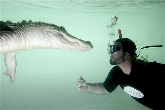 男子與鱷魚共舞。2009年1月17日,在美國(guó)佛州叢林島動(dòng)物主題公園,男子Sean Manning與一條9英尺長(zhǎng)的美洲鱷在水下上演“人鱷共舞”場(chǎng)面。Sean Manning沒有采取任何保護(hù)措施,在水下依靠通氣管進(jìn)行呼吸,表演各種高難度動(dòng)作,為觀眾上演水下人鱷大戰(zhàn)驚險(xiǎn)場(chǎng)面。