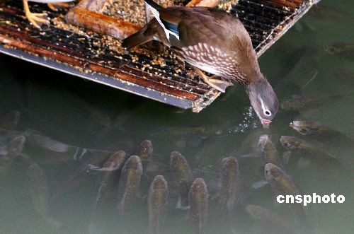3月23日,蘇州拙政園池塘內(nèi)的鴛鴦給水中魚兒“喂”食。自08年秋季蘇州拙政園飼養(yǎng)在“卅六鴛鴦館”景點(diǎn)池塘內(nèi)上演了“鴛鴦喂魚”后,曾一度被人們傳為自然界動(dòng)物親情的美談與佳話。時(shí)下,隨著今年春來水暖,該池塘里的鴛鴦們又開始充當(dāng)“愛心魚媽媽”,并爭相給成群結(jié)隊(duì)浮出水面的小魚兒“施舍”喂食,吸引了不少游客駐足觀看。中新社發(fā) 王建中 攝