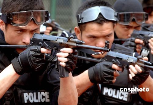 三月二十六日,三名持槍特警在福建警察學(xué)院戰(zhàn)術(shù)系教官指導(dǎo)下進行模擬演練,處置突發(fā)事件。自三月二十三日開始,來自福州、廈門、漳州、泉州等福建各地的三十八名特警,在福建警察學(xué)院進行為期一個月的封閉式訓(xùn)練,旨在提高特警處置突發(fā)事件能力。中新社發(fā) 劉可耕 攝
