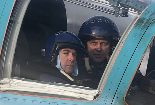 據(jù)俄媒體報道,梅德韋杰夫當(dāng)天在莫斯科郊外的“庫賓卡”空軍基地首先參觀了俄空軍新式裝備,包括S-三00和S-四00防空導(dǎo)彈系統(tǒng)。在經(jīng)過飛行前指導(dǎo)和醫(yī)學(xué)檢查后,俄羅斯總統(tǒng)身穿藍色飛行服,頭戴飛行頭盔,登上蘇—三十四戰(zhàn)斗轟炸機,坐在主要負(fù)責(zé)領(lǐng)航和武器操縱的右座,飛向藍天。
