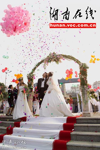 從帖子里貼的圖片來看,婚禮確實(shí)陣仗宏大,圖片中的場景大多為長沙當(dāng)?shù)氐慕志埃玳L沙湘江上標(biāo)志性的挪亞游輪等。但亦有細(xì)心網(wǎng)友提出疑問,場景中出現(xiàn)的新娘妝容及打扮均有不同,而且有一些照片甚至出現(xiàn)了數(shù)對(duì)新人,網(wǎng)友懷疑是集體婚禮。