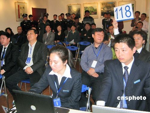 4月9日,河北省嘉海拍賣有限公司作為主拍單位,與河北省東方拍賣有限公司、河北省拍賣總行有限公司共同對(duì)三鹿集團(tuán)部分破產(chǎn)資產(chǎn)進(jìn)行拍賣。面對(duì)拍賣的三鹿集團(tuán)(山東)乳業(yè)有限公司95%股權(quán),四家公司輪番叫價(jià)毫不放松,競(jìng)爭(zhēng)激烈。北京三元集團(tuán)最終以4900萬(wàn)人民幣競(jìng)買成功。圖為北京三元集團(tuán)舉牌(118號(hào))叫價(jià)。中新社發(fā) 翟羽佳 攝