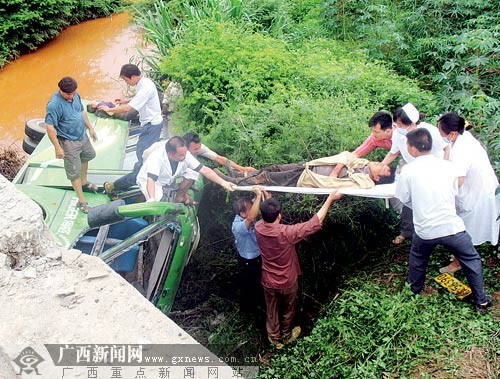 6月29日上午,322國(guó)道南寧市吳圩鎮(zhèn)那花橋發(fā)生一起造成1死46傷的交通事故,交警初步調(diào)查后認(rèn)為這起事故是由一壺潤(rùn)滑油滲漏引起的。一輛摩托車(chē)駛過(guò)淌有潤(rùn)滑油的路面時(shí)側(cè)翻,后面超載的客車(chē)為避讓前面的摩托車(chē),沖進(jìn)落差五六米的水溝,造成40多人受傷被困。事發(fā)后,受傷乘客“手拉手”自救逃生,多部門(mén)工作人員聯(lián)合開(kāi)展救援工作。