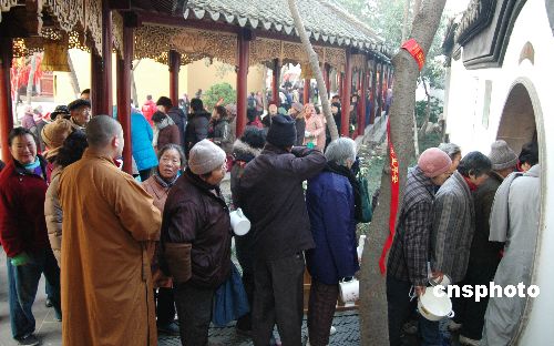 2009年1月3日,是中國(guó)傳統(tǒng)的“臘八節(jié)”,在中國(guó)民間有吃“臘八粥”的習(xí)俗。蘇州寒山寺向進(jìn)寺的市民免費(fèi)派送“臘八粥”,已成傳統(tǒng)。據(jù)悉,寒山寺當(dāng)日向市民提供“臘八粥”3800余公斤。中新社發(fā) 朱子寒 攝