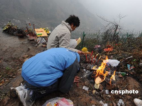 幾位北川中學(xué)的幸存學(xué)生2009年即將畢業(yè),他們?cè)谛履旯?jié)假日來(lái)到北川縣城廢墟外的望鄉(xiāng)臺(tái),遙祭被四川大地震摧毀的北川中學(xué)上千名遇難師生和親人們。中新社發(fā) 賈國(guó)榮 攝