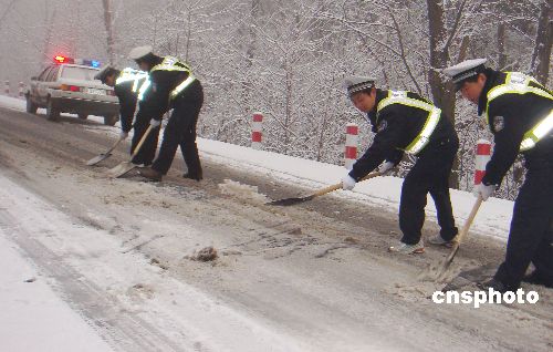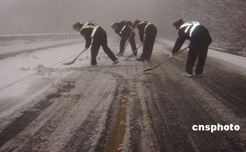 2009年1月4日,安徽省巢湖市含山縣交警大隊(duì)太湖山中隊(duì)的干警正在太湖山險(xiǎn)要路段鏟雪。元月3日夜間,該縣迎來今冬第一場雪,部分路段已積上厚厚的冰層。為了給即將來臨的春運(yùn)工作打下堅(jiān)實(shí)的基礎(chǔ),維護(hù)良好的道路交通秩序,給廣大群眾營造良好的交通環(huán)境,當(dāng)天一大早,含山縣交警大隊(duì)太湖山中隊(duì)組織民警上路巡邏,重點(diǎn)加強(qiáng)對山路的安全隱患排查清理。中隊(duì)民警鏟除幾個連速彎道上的厚層冰雪,并用掃帚將鏟除堆積的冰雪清掃出路邊,保證了過往車輛的安全通行。中新社發(fā) 豐成 攝