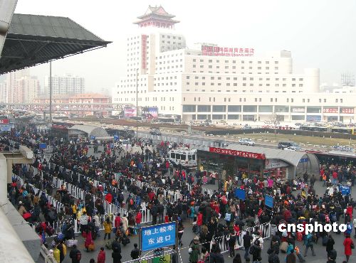 2009年1月21日,北京西站人頭攢動、旅客如織。據(jù)北京西站方面透露,根據(jù)車次的售票情況看,21日單日上車客流將超過23萬人次,達(dá)到本次春運(yùn)節(jié)前的峰值。中新社發(fā) 玉龍 攝