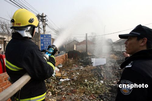 連日,北京遇大風降溫天氣。為確保春節(jié)期間燃放煙花爆竹等消防安全,近日,北京崇文警方會同消防部門清理市民居住區(qū)內(nèi)各樓道及房前屋后的可燃物,拆除在消防通道上搭建的違章建筑,并派出消防車專門對前門地區(qū)重點部位、火災(zāi)隱患較為嚴重的院落實行人工降雨,確保春節(jié)期間消防安全。中新社發(fā) 胡建強 攝
