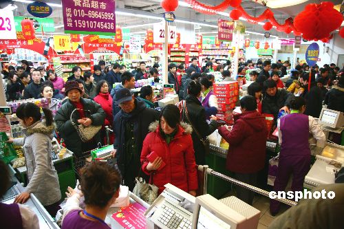 1月24日,北京市懷柔區(qū)“年貨”市場人潮涌動,市民紛紛走進食品超市選購年貨,呈現(xiàn)出紅紅火火過大年的喜慶景象。中新社發(fā) 卜向東 攝