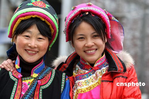 1月26日農(nóng)歷牛年第一天,5·12地震重災(zāi)區(qū)四川省北川縣擂鼓鎮(zhèn)羌族女中學(xué)英語(yǔ)教師謝紅霞(左)穿上民族節(jié)日盛裝到各個(gè)羌族村寨看望她的學(xué)生和家長(zhǎng)。去年地震發(fā)生時(shí),謝紅霞與全體教師沉著鎮(zhèn)靜地將所有學(xué)生保護(hù)到安全地帶,學(xué)生與家長(zhǎng)們由衷地感謝這些教師。中新社發(fā) 任晨鳴 攝
