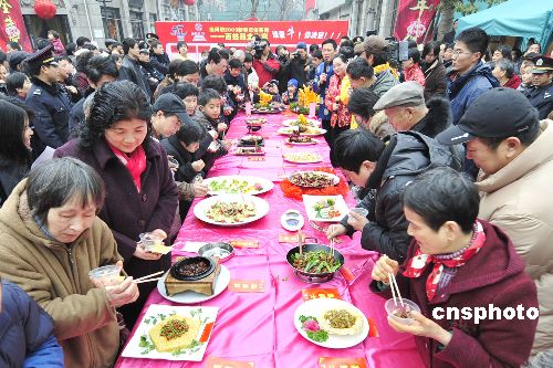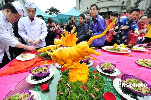 1月29日,杭州清河坊歷史街區(qū)舉辦“全牛宴”展評活動(dòng),街區(qū)內(nèi)十余家老字號(hào)餐飲業(yè)名店推出與“!庇嘘P(guān)的各式創(chuàng)新菜肴,由現(xiàn)場市民百姓品嘗并評選出“最!辈穗,展示老字號(hào)企業(yè)以創(chuàng)新創(chuàng)意迎牛年牛市的自信姿態(tài)。 中新社發(fā) 李忠 攝