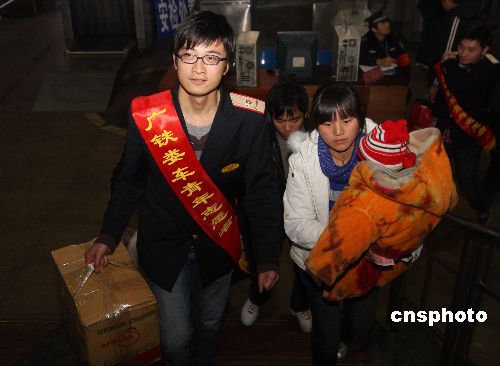1月29日,湖南省婁底車務(wù)段的青年志愿者在婁底火車站為攜帶許多行李等老弱病殘等旅客提供各種幫助。當(dāng)日,湖南省婁底火車站迎來節(jié)后返程客流小高峰,婁底車務(wù)段團(tuán)委組織近千名團(tuán)員青年志愿者開展“和諧春運(yùn)”活動,在管區(qū)內(nèi)的車站設(shè)立了被旅客稱為“愛心島”的青年志愿者服務(wù)站,為旅客提供溫馨服務(wù)。中新社發(fā) 郭國權(quán) 攝
