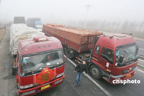2009年2月1日上午,在同三高速公路江蘇省贛榆縣出口處,車輛等待霧散通行。連日來(lái),江蘇省大部分地區(qū)遭遇持續(xù)大霧天氣,部分地區(qū)能見(jiàn)度不足50米,給旅客出行及運(yùn)輸帶來(lái)影響。當(dāng)?shù)貧庀蟛块T發(fā)布大霧黃色預(yù)警,交通安全部門提醒旅客要注意出行安全。中新社發(fā) 司偉 攝
