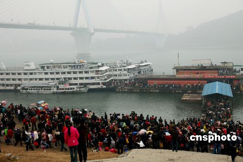 2月3日農(nóng)歷正月初九早8時,長江宜昌港大公橋客運(yùn)碼頭四條躉船無一客人、無一客船,9時,9艘客船同一船閘、同時停泊宜昌港,一時間,涌入宜昌港口的出川大軍疏散成“井噴”之勢。宜昌海事、公安、港口等部門聯(lián)動執(zhí)法,35分鐘時間內(nèi)緊急疏散4500余人,全部是出川農(nóng)民工。據(jù)統(tǒng)計,三峽春運(yùn)期間,常年旅客進(jìn)出客流量約50萬人次,其中外出農(nóng)民工乘船超過40余萬人次。據(jù)悉,三峽庫區(qū)是長江干線跨省春運(yùn)重點(diǎn)航線,而這一航線又是中國內(nèi)河農(nóng)民工乘船的專營航線,節(jié)前單邊返鄉(xiāng)過年,節(jié)后單邊出川進(jìn)城打工,客船單邊旅客、客船高度集中,是中國內(nèi)河不多見的春運(yùn)現(xiàn)象。中新社發(fā) 望作信 攝