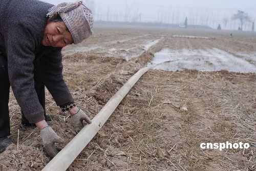 2009年2月4日,山西小麥產(chǎn)地運城新絳縣農(nóng)民在全力以赴進行抗旱工作。入冬后,山西省受旱面積達(dá)3274萬畝,其中山西小麥主產(chǎn)區(qū)運城、臨汾兩地農(nóng)作物受旱面積達(dá)634萬畝,同時有106萬群眾及19萬頭牲畜出現(xiàn)飲水難問題。2月3日,山西省政府防汛抗旱指揮部已發(fā)布干旱橙色預(yù)警(Ⅱ級)并啟動響應(yīng)行動。山西省財政緊急下?lián)芸购蒂Y金1000萬元。中新社發(fā) 高新生 攝