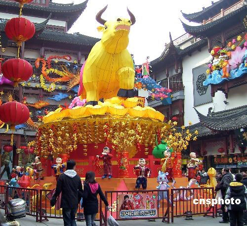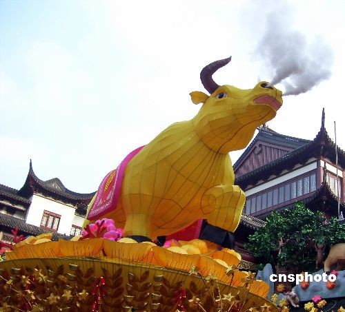 2009年2月6日,一個長7米、高3米的巨型“牛燈”在上海豫園元宵燈會上閃亮登場!芭簟钡谋强走會冒煙,以應(yīng)和“牛氣沖天”的寓意。中新社發(fā) 井韋 攝
