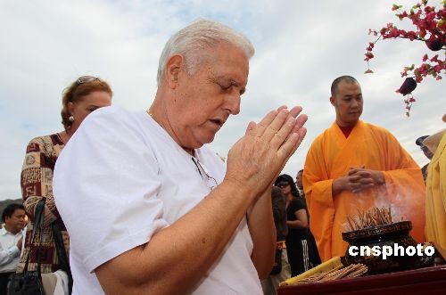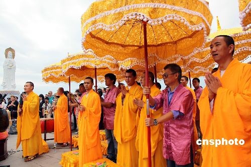 2月9日元宵節(jié),海南三亞南山寺全體僧眾在三亞南山文化旅游區(qū)內(nèi)的108米南海觀音圣像前舉行祈福法會(huì),共唱佛贊,并放飛和平鴿,祈愿國(guó)泰民安、萬家團(tuán)圓。本次祈福法會(huì)吸引了近3000多名信眾和游客參加。中新社發(fā) 陳文武 攝
