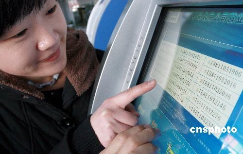 2月21日,中國移動(dòng)3G手機(jī)“188”號段放號進(jìn)入第二天,北京市民在營業(yè)廳內(nèi)的自動(dòng)終端前挑選自己滿意的手機(jī)號碼。2月20日起北京移動(dòng)正式對188號段進(jìn)行放號,188號段SIM卡是特別針對3G終端,只能在移動(dòng)3G終端上使用,北京的手機(jī)用戶開始進(jìn)入了3G時(shí)代。中新社發(fā) 鄭雄增 攝