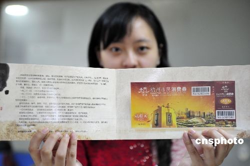 2月23日,10萬冊(cè)《杭州市市民消費(fèi)券珍藏冊(cè)》在杭州公開發(fā)行。1月20日起,杭州市向全市六城區(qū)67萬特殊人群發(fā)放了1億元消費(fèi)券,在過去的一個(gè)月內(nèi),已經(jīng)十分有效地達(dá)到了“保障民生,拉動(dòng)消費(fèi)”的目標(biāo)。在此前提下,為滿足廣大市民珍藏消費(fèi)券,保存這份特殊記憶的要求,市財(cái)政部門特別制作并發(fā)行10萬冊(cè)《杭州市市民消費(fèi)券珍藏冊(cè)》,每冊(cè)收藏五張“杭州市民消費(fèi)券”,每張面值20元,價(jià)值100元,整冊(cè)發(fā)行價(jià)亦為100元人民幣。冊(cè)內(nèi)消費(fèi)券不僅具有收藏價(jià)值,也可以憑券消費(fèi),同時(shí)享受商家提供的優(yōu)惠服務(wù)。中新社發(fā) 李忠1 攝