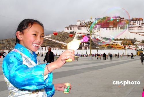 2009年2月25日,藏歷土牛新年大年初一,藏族小朋友們穿著新衣服過(guò)大年。中新社發(fā) 張權(quán) 攝
