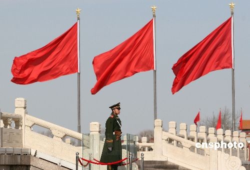 2009年3月1日,“兩會(huì)”即將召開(kāi),北京天安門(mén)廣場(chǎng)及周邊建筑掛起了紅旗,廣場(chǎng)上一片喜慶祥和氣氛。中新社發(fā) 魯谷 攝