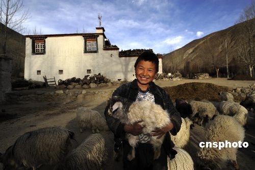 3月初,西藏尼木縣吞巴鄉(xiāng)的一名少年歡喜地抱著自家羊圈里的羊羔。該鄉(xiāng)地處前藏和后藏的結(jié)合部,盛產(chǎn)藏香。中新社發(fā) 廖攀 攝