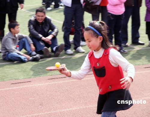 3月7日,主題為“關愛農民工·共建和諧家庭”的返鄉(xiāng)農民工家庭趣味運動會在重慶大學城第二小學舉行,當?shù)?7戶農民工家庭參加了“家庭跳繩”、“搬運物品”、“齊心協(xié)力接力賽”等項目的比賽。圖為一位農民工子女正在參加“搬運物品”比賽。中新社發(fā) 銀雪 攝