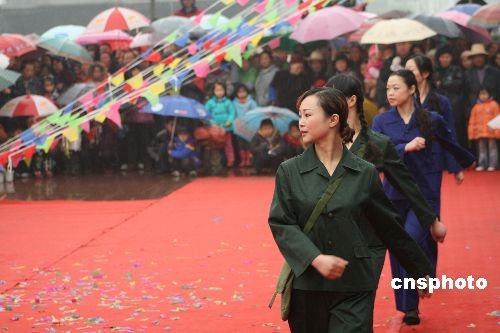 3月8日,四川丹棱縣的農(nóng)村姑娘冒雨進行時裝秀表演。當(dāng)日,四川丹棱縣農(nóng)耕文化展在該縣丹棱鎮(zhèn)興隆村拉開帷幕,當(dāng)?shù)剞r(nóng)村姑娘冒雨進行時裝秀表演,在展示各個時期農(nóng)村服裝變化的同時,慶!叭恕眿D女節(jié)。中新社發(fā) 堯遙 攝