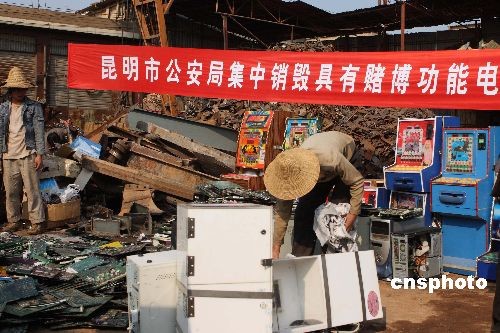 三月十三日,昆明市公安局集中銷毀賭博性游戲機(jī)及電路板共1560件,價(jià)值上百萬(wàn)元人民幣。這種賭博游戲機(jī)通過無(wú)線收發(fā)器來控制內(nèi)部的電腦,達(dá)到操縱賭博結(jié)果的目的。圖為被銷毀的賭博游戲機(jī)。中新社發(fā) 劉冉陽(yáng) 攝