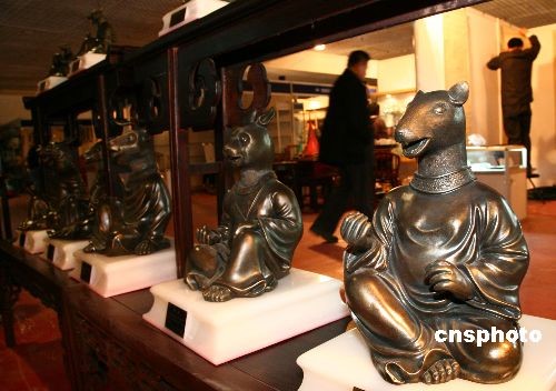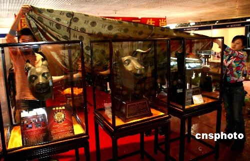 3月18日,圓明園獸首在第七屆全國工藝品、旅游品、禮品博覽會上亮相。當日,第七屆全國工藝品、旅游品、禮品博覽會在大連星海會展中心展出,圓明園十二生肖獸首精仿品亮相。這次展出的獸首分全套縮小比例展品部分和全套人身獸首縮小比例部分,其中,牛首、兔首和鼠首均是按照實物1:1比例設計制作的。中新社發(fā) 徐德武 攝