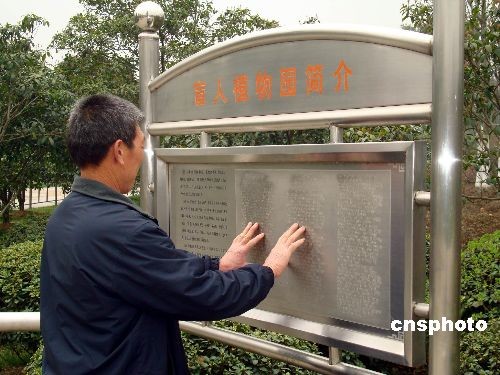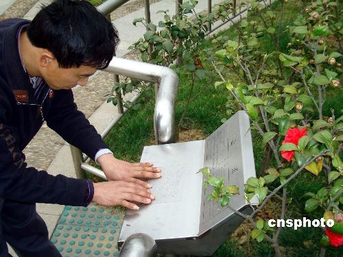 2009年3月19日,盲人在蘇州盲人植物園內(nèi)“手讀”盲文植物介紹。陽(yáng)春三月,春暖花開(kāi),一些盲人來(lái)到蘇州盲人植物園踏青“賞”花。蘇州盲人植物園占地面積12000多平方米,有60多種觀賞植物。每種花草樹木前都有盲文寫的植物介紹,還配有語(yǔ)音輔助系統(tǒng),只要盲人一觸摸,就會(huì)有相應(yīng)的語(yǔ)音服務(wù)為盲人介紹相關(guān)植物知識(shí)。中新社發(fā) 王建康 攝