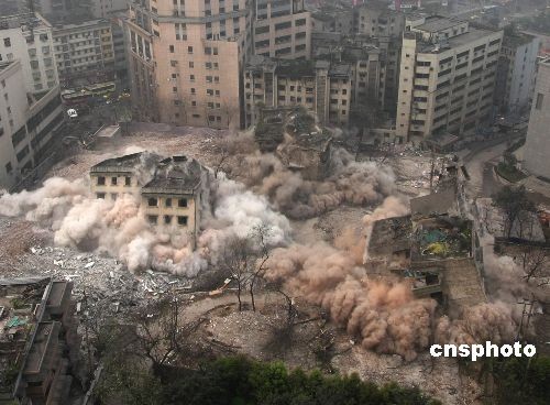 2009年3月21日,重慶江北區(qū)觀音橋處成功進(jìn)行了危舊房定向爆破。當(dāng)日早晨8時(shí),一聲巨響,當(dāng)?shù)赜灞倍宥柕貕K的6棟樓房被爆破拆除,總面積1000平方米。這是重慶2009年危舊房改造的第一爆,是觀音橋商圈快速推進(jìn)“長江上游商貿(mào)中心”的重要舉措。中新社發(fā) 賀終榮 攝