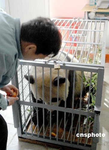 3月22日,在北京動物園生活了9個月的8只奧運大熊貓開始起程返回四川老家。臨行前,工作人員正在喂大熊貓食物,并依依不舍為其送行。中新社發(fā) 鄭雄增 攝