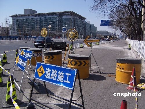2009年3月25日,北京長安街西單文化廣場前非機動車道,近40平方米路面發(fā)生輕微沉降。事發(fā)后,該路面被交管部門臨時封閉,F(xiàn)場勘測人員介紹,沉降路面下方為地鐵四號線與一號線的換乘通道,此處路面沉降約1.85厘米。目前,相關(guān)工程暫停施工。中新社發(fā) 九州 攝