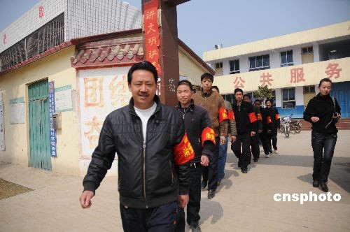 3月25日,兩支主要由返鄉(xiāng)農(nóng)民工和大學(xué)生村官組成的治安巡邏隊(duì)奔赴河南省南陽(yáng)市臥龍區(qū)武候街道的城鄉(xiāng)“戰(zhàn)場(chǎng)”。去年以來,武候街道共吸納150名返鄉(xiāng)農(nóng)民工和大學(xué)生村官,組成城鄉(xiāng)治安巡邏隊(duì),對(duì)城市社區(qū)和農(nóng)村鄉(xiāng)鎮(zhèn)實(shí)行24小時(shí)不間斷治安巡邏。巡邏隊(duì)員每人每月可獲得300元的崗位補(bǔ)助,而且,周六、周日和節(jié)假日還可享用二至三倍的加班費(fèi)。 中新社發(fā) 付海厚 攝