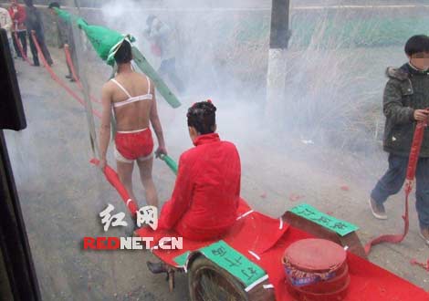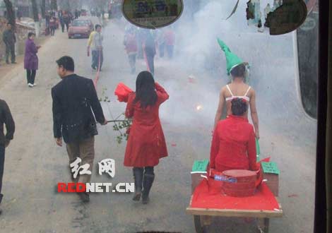 25日上午,網(wǎng)友“鍋爐工”在紅網(wǎng)論壇發(fā)帖,再現(xiàn)了一場(chǎng)“雷人”婚禮,帖子描述道“這男人扮牛頭,拉個(gè)‘投胎轉(zhuǎn)世車’拖著老婆回家,新娘后面放著幾掛鞭炮,據(jù)說是驅(qū)鬼用,拉著上‘奈何橋’好恐怖。
