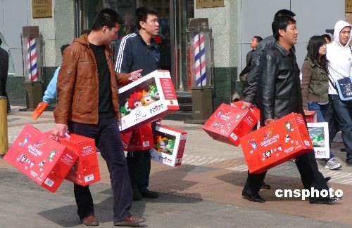 2009年3月31日,北京王府井奧運(yùn)特許商品店,顧客竟相搶購各類奧運(yùn)紀(jì)念品。當(dāng)日,手提大包小裹奧運(yùn)紀(jì)念品的人們成為金街一道靚麗風(fēng)景。按照相關(guān)規(guī)定,奧運(yùn)特許商品銷售日期截止到31日24時(shí)。北京一些大型商場內(nèi)的奧運(yùn)特許商品銷售點(diǎn)紛紛以超低價(jià)格進(jìn)行拋售。中新社發(fā) 玉龍 攝