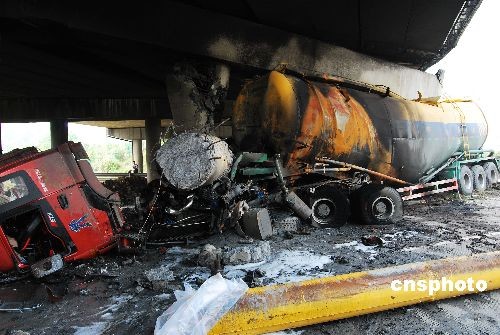 4月17日凌晨,在湖南郴州市郴資桂高等級公路與京珠高速公路交叉處,一輛水泥槽罐車由東往西方向行駛,因貨車司機疲勞駕駛撞上京珠高速主線由南往北橫跨郴資桂大橋(K490+200北上)的橋墩上,造成貨車起火,兩根立柱斷裂,一根立柱受損,該大橋橫梁塌落,往北方向的橋面塌陷,京珠高速公路耒宜段郴州至良田被迫中斷交通。肇事車輛上1人死亡,1人受傷,1人逃逸。事故發(fā)生后,湖南省郴州市、省交通廳、省高速公路管理局領(lǐng)導(dǎo)立即趕赴現(xiàn)場,指導(dǎo)現(xiàn)場處置、交通救援和事故處理,做好保安全、保暢通、保穩(wěn)定工作。上午10時南行線通車,下午14時,單幅雙向間斷恢復(fù)通車。目前,省市有關(guān)部門正在緊急進行橋梁的加固搶修,防止橋面整體坍塌。事故原因進一步調(diào)查和善后處理正在有序進行之中。中新社發(fā) 賀茂峰 攝