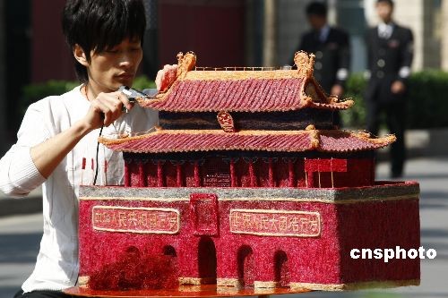 為迎接60周年大慶,北京一位發(fā)型設(shè)計(jì)師用碎頭發(fā)制作了一個(gè)微型“天安門”,總共用了11公斤長短不一的碎頭發(fā),歷時(shí)5個(gè)多月才完工。這位來自四川的青年理發(fā)師,此前還為奧運(yùn)獻(xiàn)上了頭發(fā)絲作的“鳥巢”、“水立方”、“福娃”等,并贏得了國內(nèi)外游客的好評(píng)。中新社發(fā) 鄭雄增 攝