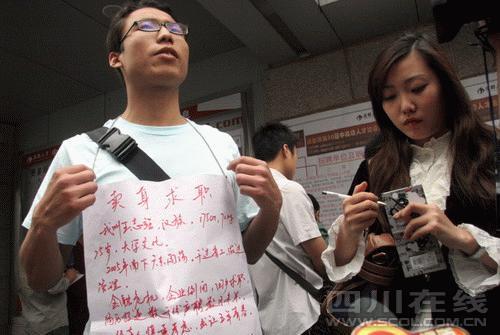 想找份好工作,就要學(xué)會(huì)推銷(xiāo)自己。昨(26)日上午,成都市人才市場(chǎng)門(mén)口出現(xiàn)了讓人目瞪口呆的一幕:一名25歲的小伙子身掛“求職”招牌,尋求一份年薪10萬(wàn)元的工作。如此推銷(xiāo)自己,他也坦然承認(rèn):我就是在包裝自己而已。