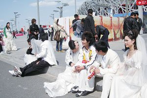 這11對新人的攝影師姚先生介紹,他們來自天津薊縣,11對新人均為影樓顧客。為了在鳥巢、水立方前留下結(jié)婚紀(jì)念,這11對新人專程組團(tuán)來到奧林匹克公園。