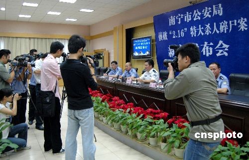 四月三十日,轟動(dòng)廣西首府南寧市的“覃氏三姐妹慘遭碎尸”案宣布告破,南寧市公安局就此舉行新聞發(fā)布會(huì)。二00九年二月十二日,家住南寧市西鄉(xiāng)塘區(qū)的覃女士向公安機(jī)關(guān)報(bào)案,稱(chēng)其住嘉州華都小區(qū)的三個(gè)妹妹在二月十日晚失蹤。十六日,公安機(jī)關(guān)在南寧郊區(qū)發(fā)現(xiàn)多個(gè)散發(fā)惡臭的袋子,所裝之物為被肢解的尸塊,經(jīng)法醫(yī)鑒定,屬失蹤的三姐妹。南寧市公安局官員在發(fā)布會(huì)上介紹,犯罪嫌疑人蘭某乃三姐妹對(duì)門(mén)的鄰居,因工作及感情生活不如意等,欲強(qiáng)奸女性宣泄欲望,事后怕行徑敗露,蘭某遂一一殺死覃氏三姐妹并肢解拋尸郊外荒野。中新社發(fā) 王剛 攝